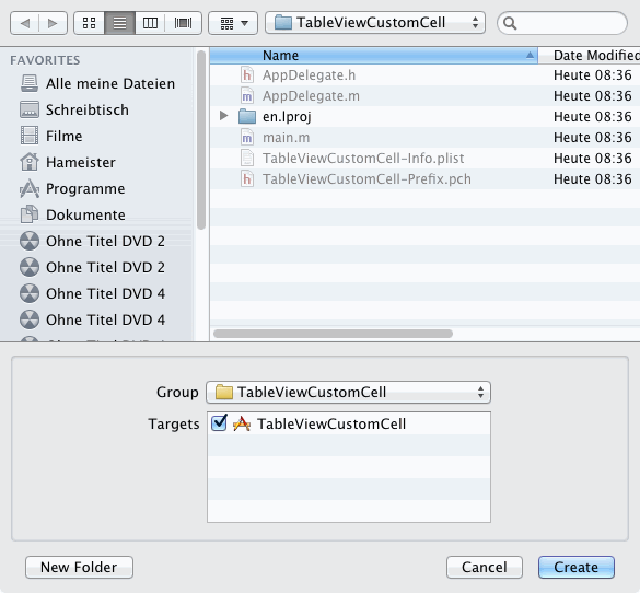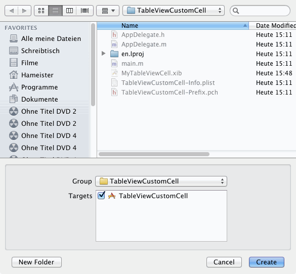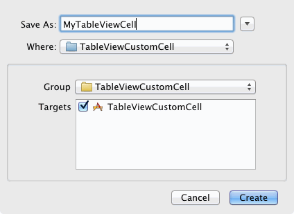 Unter Save As: wird den Name der Xib-Datei eingetragen. Man wählt MyTableViewCell und schließt den Dialog mit Create