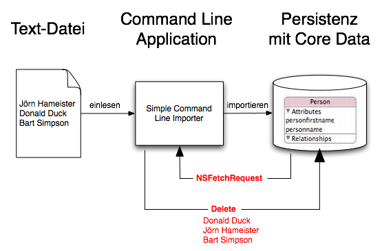 Ausgehend von dem Tutorial Simple Core Data Command Line Importer werden nun alle Core Data Datensätze ausgelesen und dann gelöscht. Zum Löschen wird die Methode deleteObject