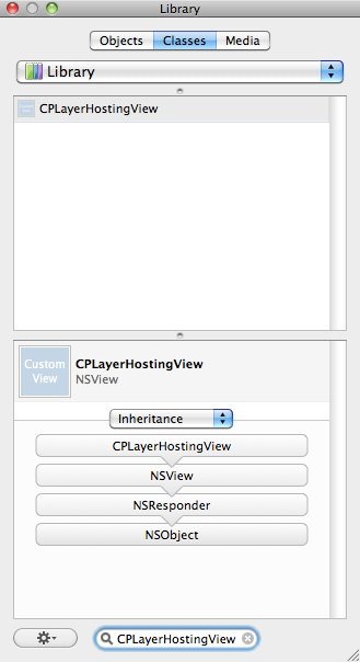 Dann die Library mit cmd-shift-L öffnen, falls sie nicht schon offen ist. Dort Classes anklicken und unten im Suchfeld CPLayerHostingView