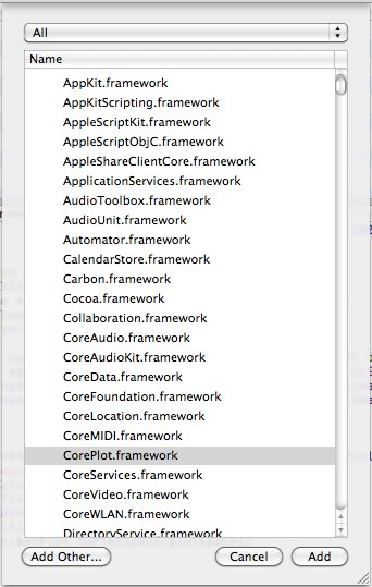 Als erstes sollte das CorePlot.Framework hinzugefügt werden. Dafür muß unter Groups&Files der Ordner Frameworks selektiert werden. Nach einem Rechtsklick, kann im Popup-Menü Add->Existing Framework ausgewählt werden. In dem Auswahldialog wird das CorePlot.framework mit Add hinzufügt.
