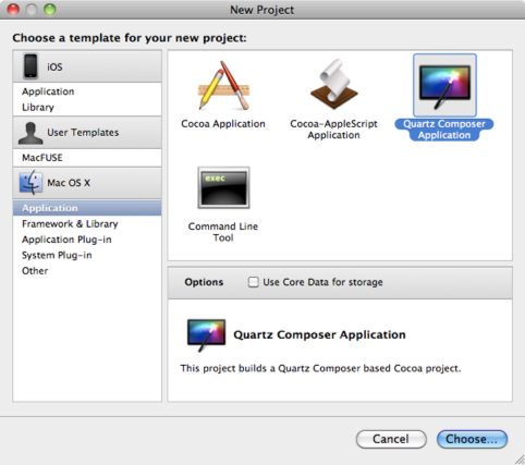 Als erstes muß ein neues Projekt in Xcode angelegt werden. Als Typ wird dabei eine Quartz Composer Application gewählt. Der Grund für die Wahl dieses Typs ist, daß auf diese Weise bereits eine XIB-Datei angelegt wird und alle benötigten Frameworks im Projekt enthalten sind. Im einzelnen sind das: Quartz.framework, Cocoa.framework, AppKit.framework, Foundation.framework und CoreData.framework. Wobei das CoreData.framework in dem Beispiel nicht verwendet wird.