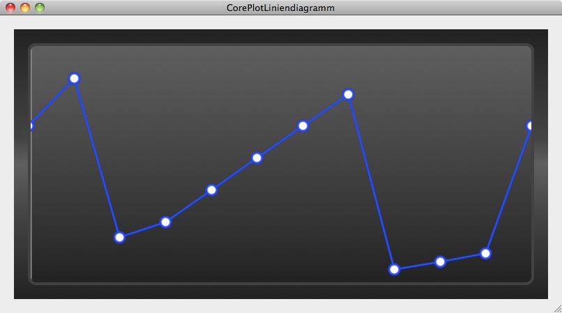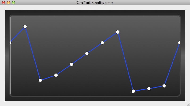 In dem Beispiel wird ausgehend von Tutorial: CorePlot Liniendiagramm das Liniendiagramm so angepaßt, daß eine blaue, gestrichelte Linie mit runden weißen Markierungen zu sehen ist. Dabei wird die Breite der Markierungsumrandung verändert und die Füllfarbe wird über den rgb-Wert festgelegt. Die Veränderungen werden sukzessive in dem Beispiel ergänzt.