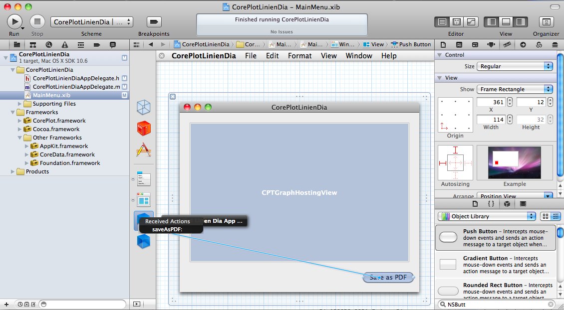 verbunden. Dazu wird im InterfaceBuilder der Push Button (Save as PDF) selektiert und mittels crtl-drag auf den Core Plot Linien Dia App Delegate gezogen. Dort wird saveAsPDF ausgewählt.