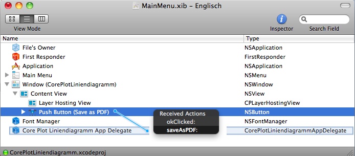 verbunden. Dazu wird im InterfaceBuilder das MainMenu.xib ausgewählt, der Push Button (Save as PDF) selektiert und mittels crtl-drag auf den AppDelegate gezogen. Dort wird saveAsPDF ausgewählt.