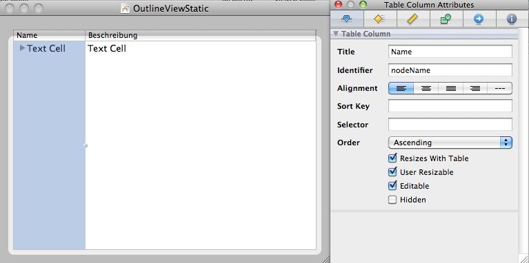 Durch einen Doppelklick auf die Spaltennamen läßt sich Name und Beschreibung eintragen. Wie oben schon angesprochen, muß für die eindeutige Identifikation der Spalten in der Methode outlineView:objectValueForTableColumn:byItem