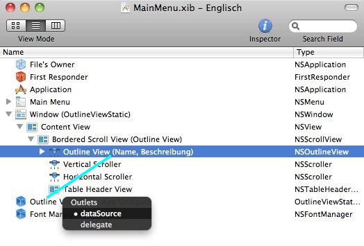 Als letztes wird in das Fenster MainMenu.xib gewechselt und es wird mittels ctrl-mousedrag von der Outline View auf Outline View Static App Delegate die DataSource gesetzt.