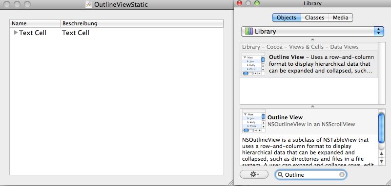 Mit einem Doppelklick auf die Datei MainMenu.xib wird der InterfaceBuilder gestartet. Falls die Library noch nicht geöffnet ist, wird sie mit cmd-shift-L eingeblendet. In der Library wird die Outline View ausgewählt und mit gedrückter Mouse-Taste in das Fenster (OutlineViewStatic) gezogen.