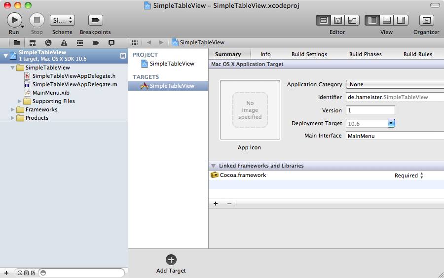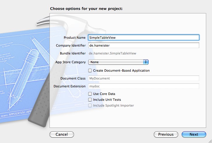 Als Projektname kann beispielsweise SimpleTableView verwendet werden. In der folgenden Abbildung ist das angelegte Projekt zu sehen.