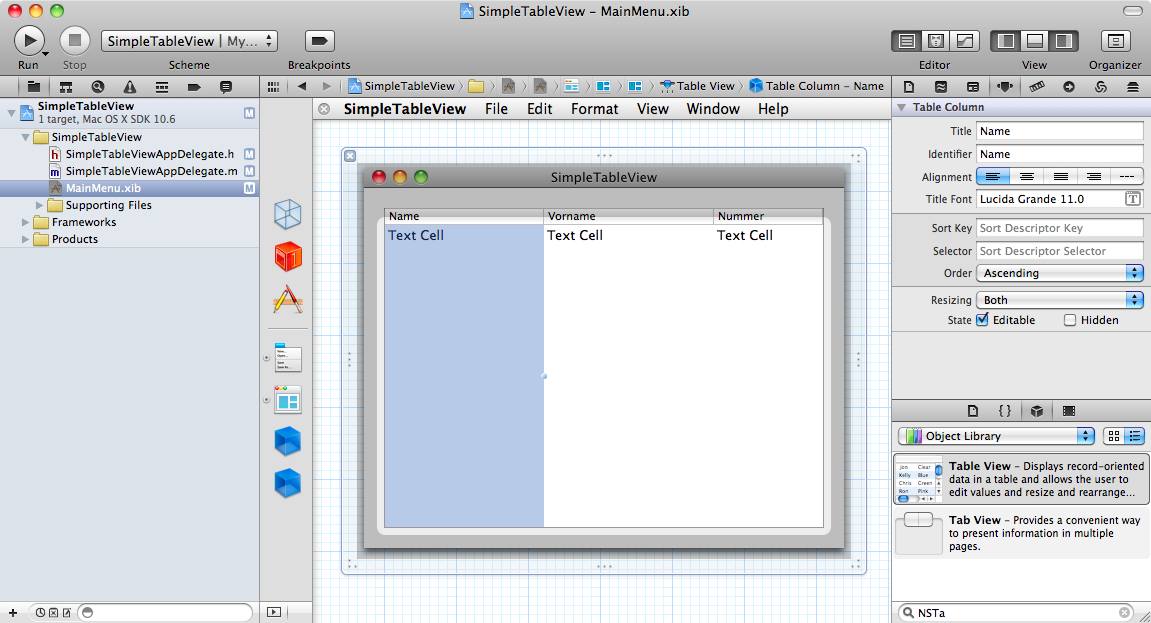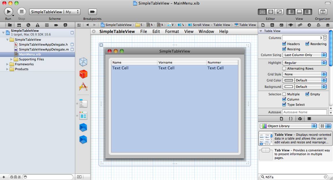 selektiert, woraufhin sich der Interface Builder (IB) öffnet. Dort wird in der ObjectLibrary nach NSTa gesucht und die NSTableView