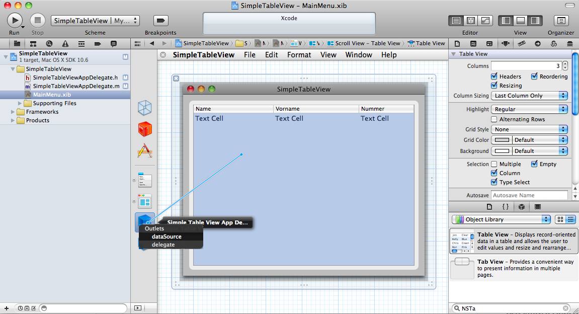 noch die DataSource zugeordnet bekommen. Dazu selektiert man die Tabelle und zieht den Cursor bei gedrückter Mouse-Taste auf Simple Table View App Delegate